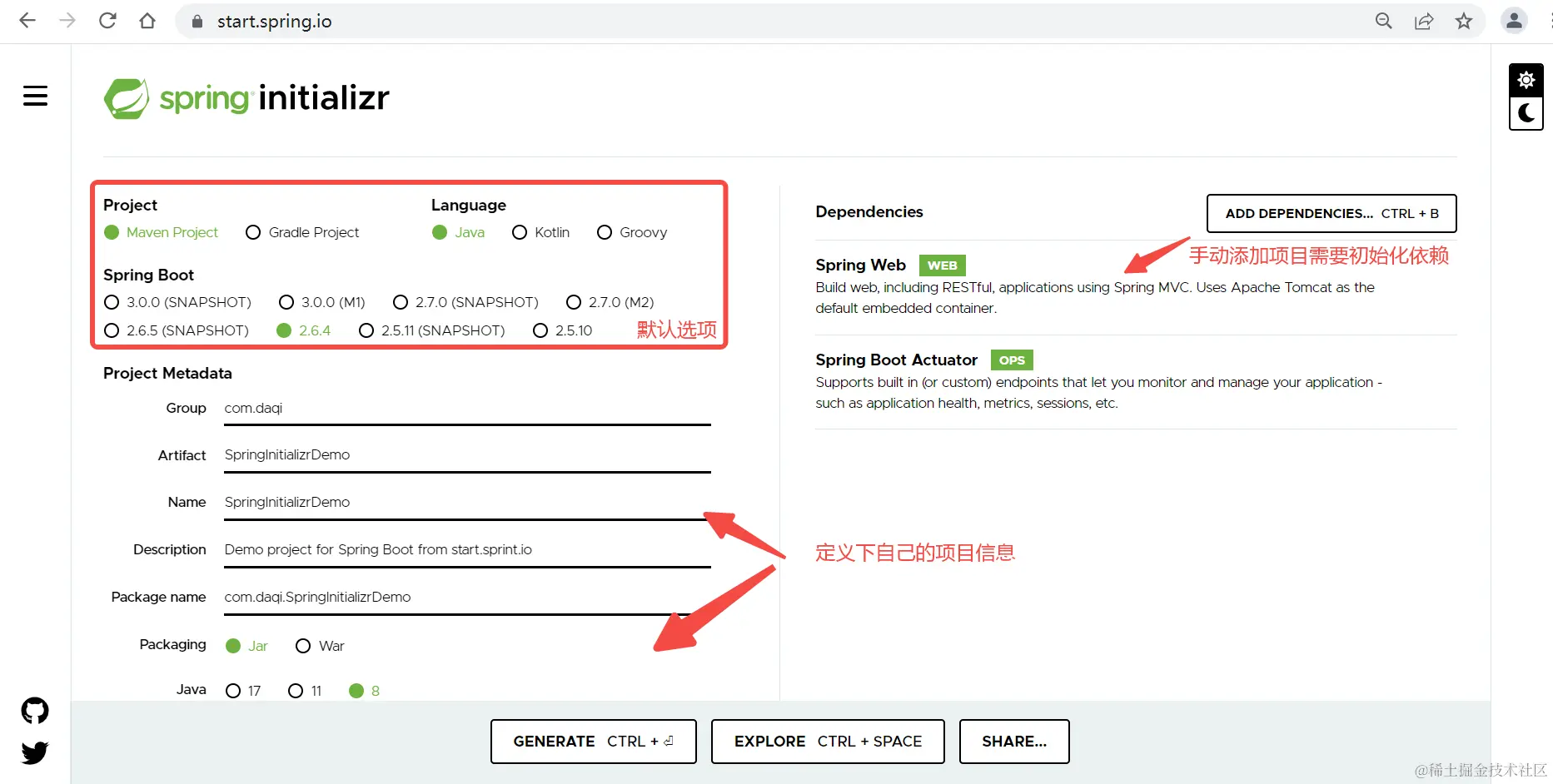 Step1. 通过访问 start.spring.io/ 选择开发选项和添加依赖包一键生成应用包。