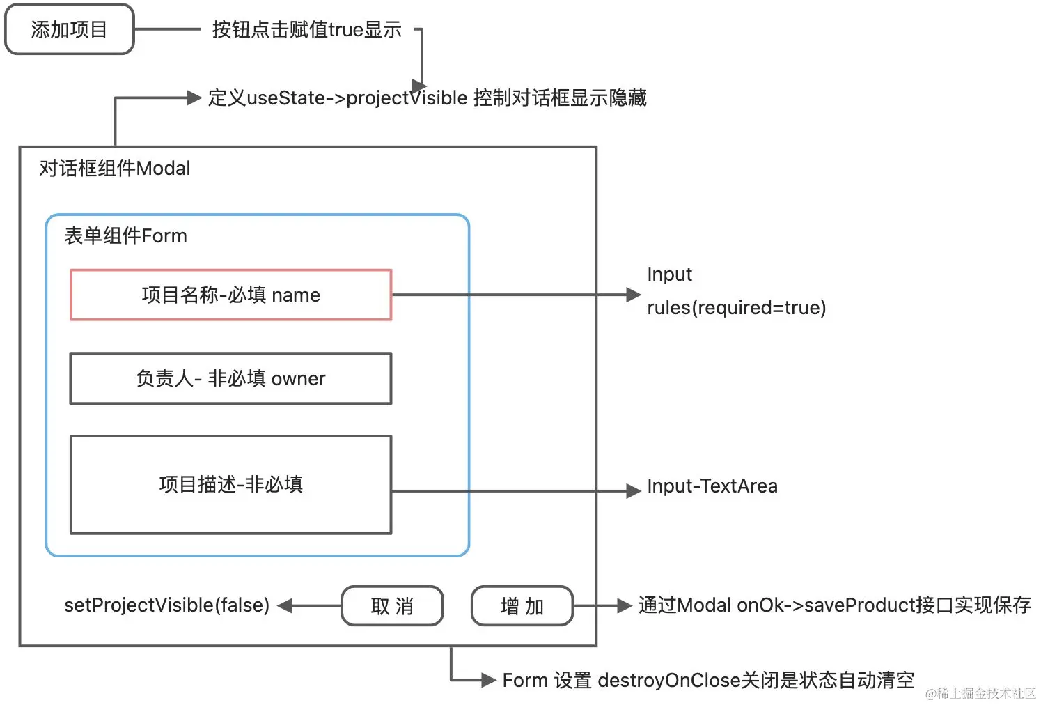 经过上边的组件学习,接下来基于上述基础知识实战应用下,利用对话框内嵌表单,实现Mock平台项目增加功能,按照之前页面开发建议,简单画一个实现层级和为代码定义,有助于辅助开发。