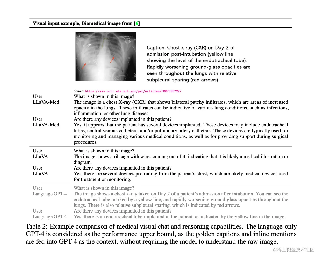 训练速度:一个显著的特点是,LLaVA-Med 被宣称在短短一天内进行了培训。这一点表明了模型训练的高效性和可扩展性,这对于大规模NLP/CV模型在医学领域的应用非常重要。