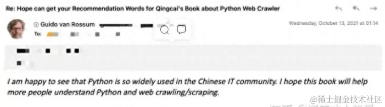 为了得到他的推荐,把当时审核完的 1000 多页稿件、书的内容介绍和候选推荐语全翻译成了英文版并发给了他,经过 Director 的帮助和他自己的努力,龟叔回复了崔老师,并给他写了推荐语。