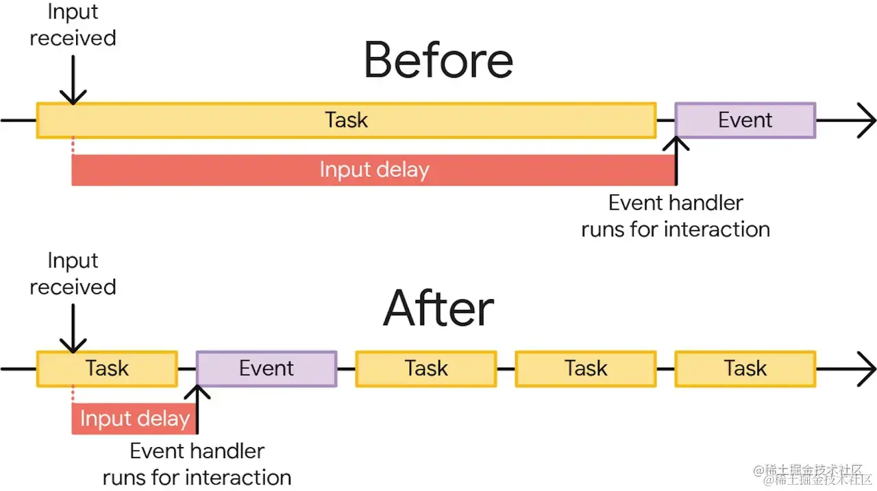 它不仅仅测量首次交互,而是所有交互延时。除了输入延时,还包括事件处理时长,渲染延时。它的目标是确保从用户开始交互到下一帧绘制的时间尽可能短,以满足用户进行的所有或大多数交互。