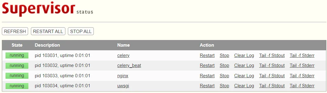 $ supervisorctl status celery RUNNING pid 2298, uptime 0:01:01 celery_beat RUNNING pid 2299, uptime 0:01:01 nginx RUNNING pid 2300, uptime 0:01:01 uwsgi RUNNING pid 2301, uptime 0:01:01