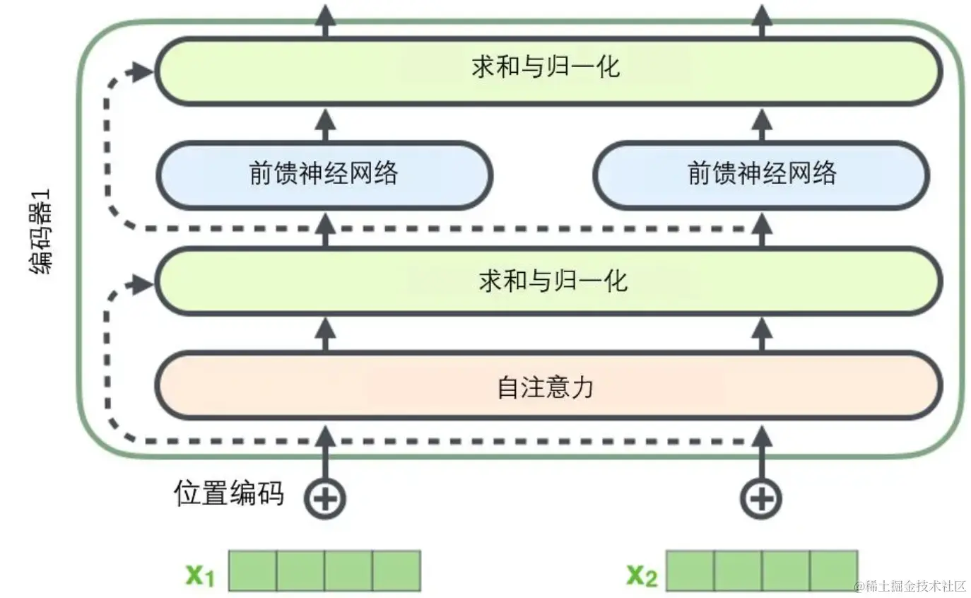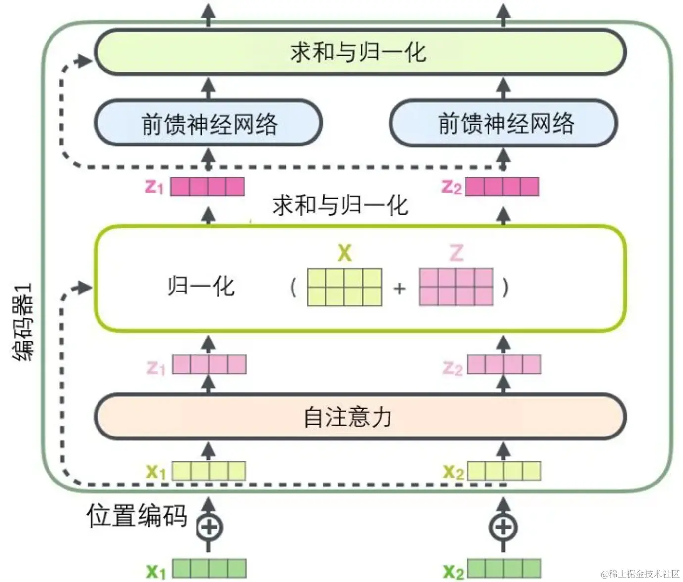 - X表示多头或者前馈神经网络的输入,MultiHeadAttention(X) 和 FeedForward(X) 表示输出 (输出与输入 X 维度是一样的,所以可以相加)。