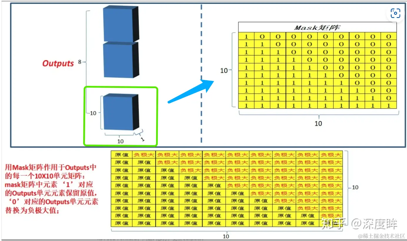 - 具体操作其实是加了一个 与输入矩阵形状相同的mask 矩阵,这样就可以把每一次计算当前时间后的信息盖住;