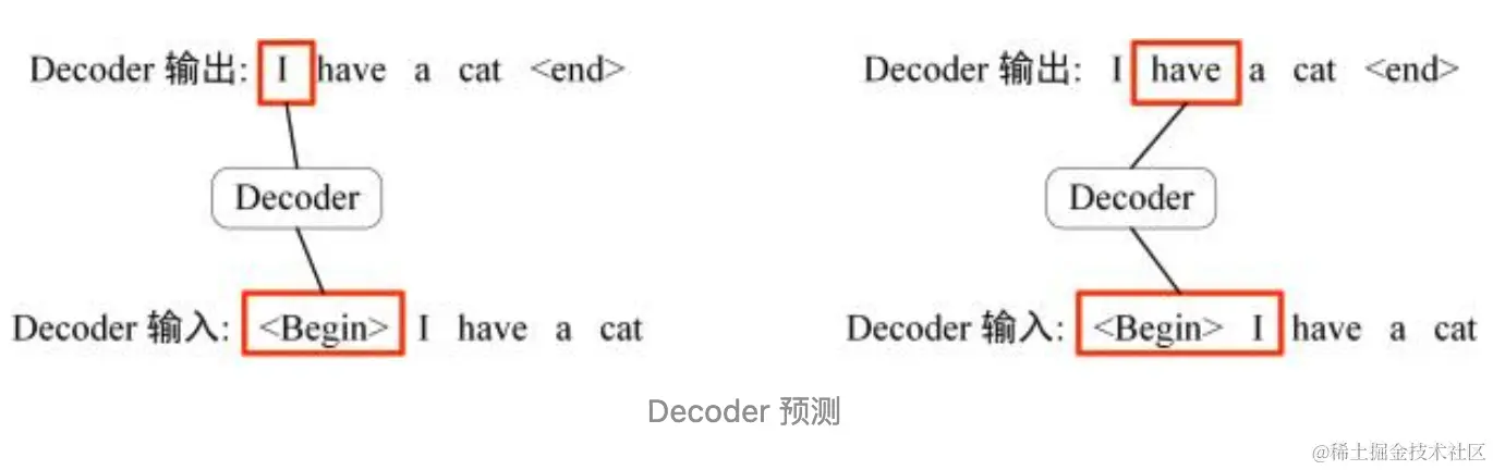- 流程就是:首先输入< Begin >作为 decode 侧的开始标志预测第一个单词,得到 I 后,然后将"< Begin > I"作为下一次预测的输入,以此类推