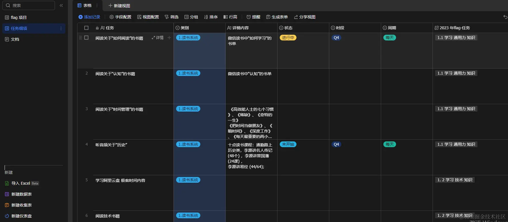 对于读书任务来说 任务是某一个领域的(认知/心理/理财/技术/,,,,,,),而详情内容就是 认知领域的数据有哪些,理财领域的书籍有哪些