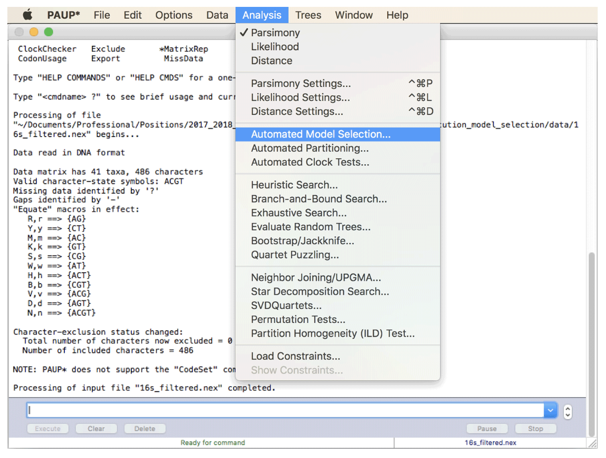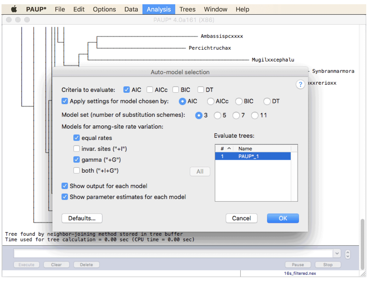 - “自动模型选择”选项可以在 PAUP* 的“分析”菜单中找到。但是,当您单击它时,您会看到为了运行此模型选择,需要系统发育。虽然这可能看起来可能会导致循环推理(选择替代模型是最大似然系统发育分析所必需的,但也取决于系统发育),但这在实践中不是问题,因为模型选择的结果并不强烈依赖于正确的系统发育;因此,任何合理的系统发育都会导致相似的模型选择结果。因此,最好的解决方案是使用 Neighbor-Joining 算法运行快速系统发育分析,该算法也可以在 PAUP* 中方便地实现。