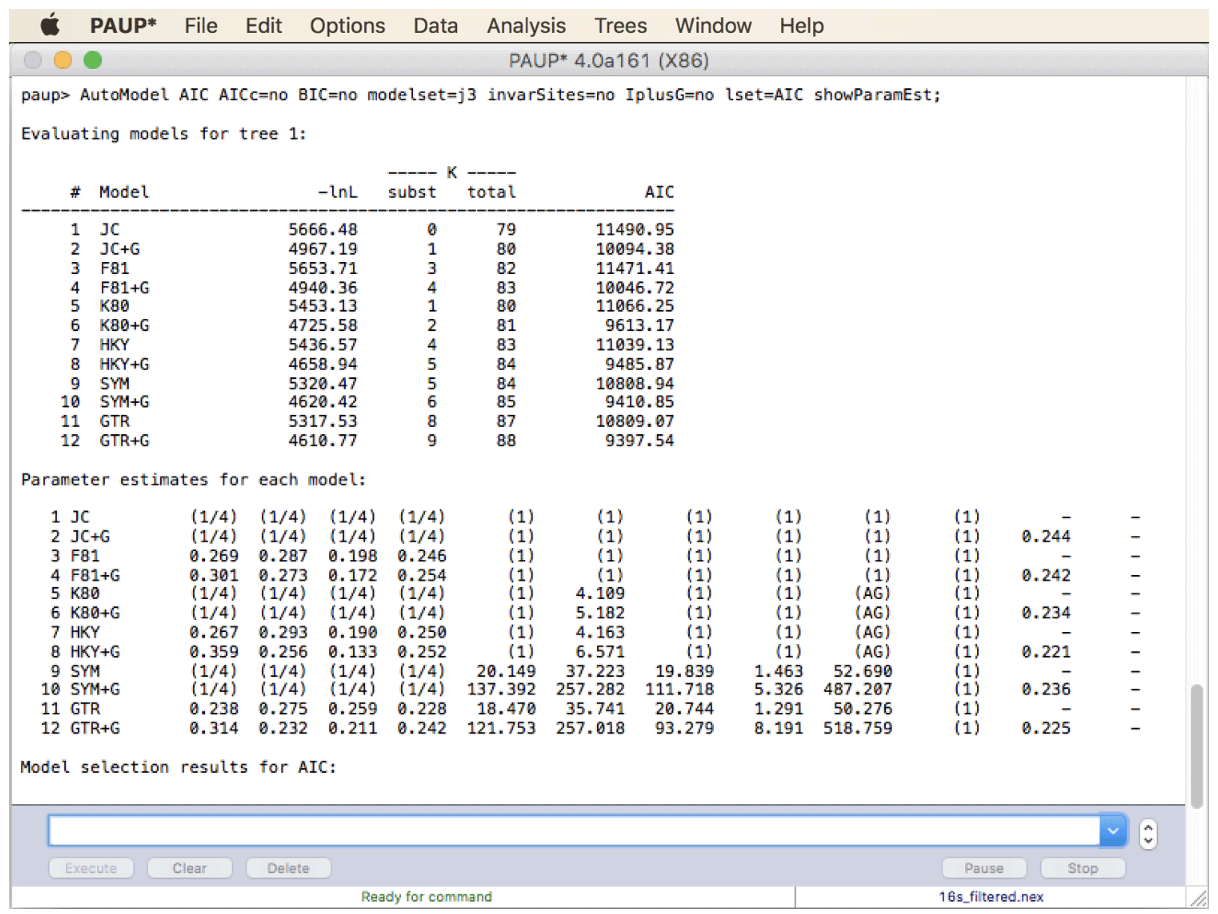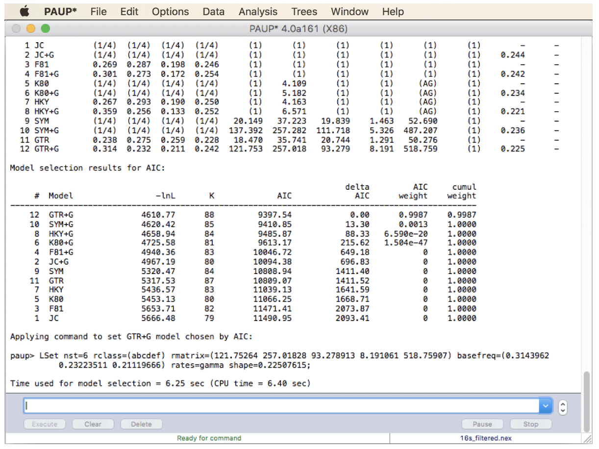 基于替换模型与序列数据的拟合程度的比较已在多种工具中实现,并且最常使用程序 jModelTest 进行。但由于最近在 PAUP* 中实现了自动选择替代模型,并且该存储库中的其他教程无论如何都需要安装 PAUP*,因此我在这里使用 PAUP* 而不是 jModelTest 来进行模型选择。实际上,两个程序之间的模型选择非常相似。