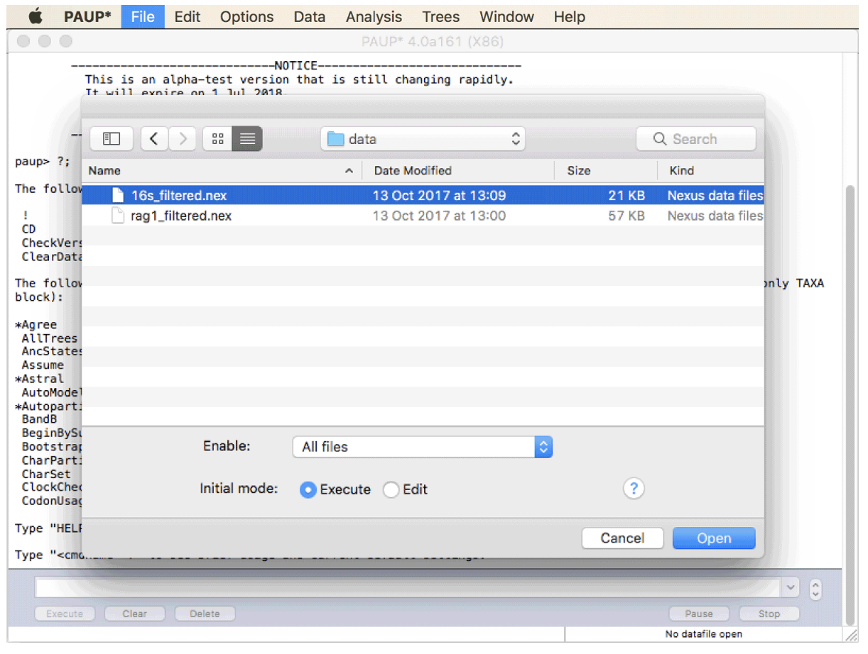 - 单击 PAUP* 的“文件”菜单中的“打开...”。确保在打开的窗口底部选择“执行”作为初始模式,如下一个屏幕截图所示。选择 Nexus 格式的 16s 序列对齐文件 (16s_filtered.nex),然后单击“打开”。 PAUP* 将给出其对该文件的解释的简短报告,包括在比对中发现的物种(分类单元)和字符的数量。
