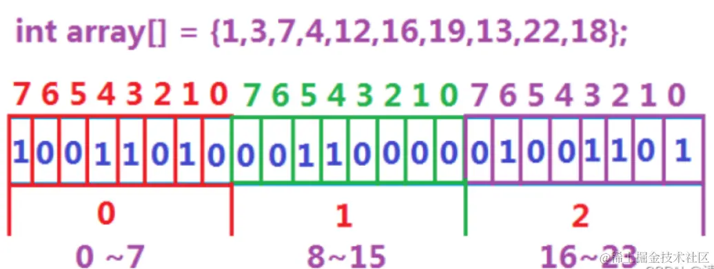 数据是否在给定的整形数据中,结果是在或者不在,刚好是两种状态,那么可以使用一个二进制比特位来代表数据是否存在的信息,如果二进制比特位为1,代表存在,为0代表不存在。比如: