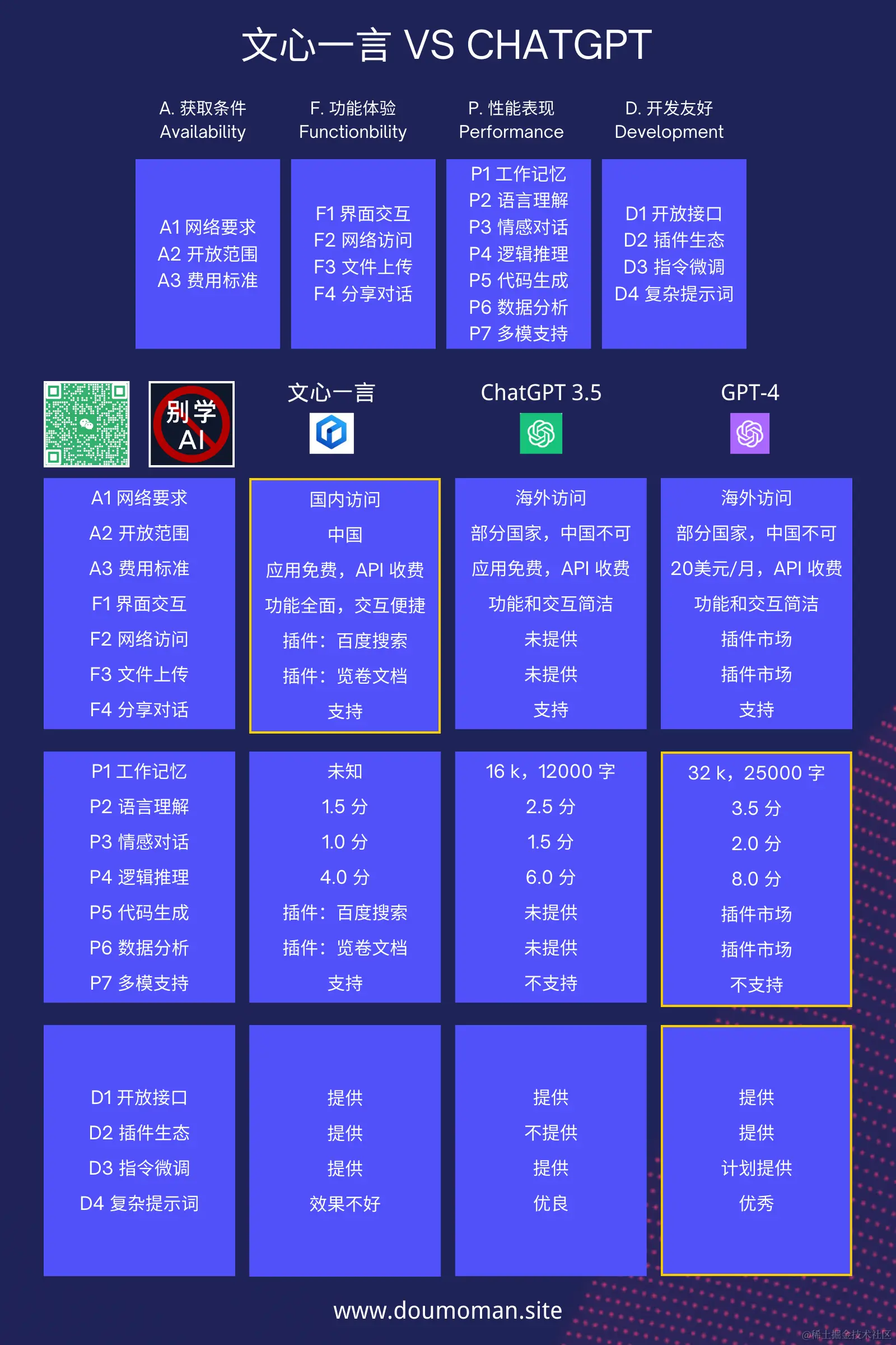 但是,作为普通用户,用不用得顺手、爽也很重要,于是豆茉君重点比较了文心一言和 ChatGPT 的两个版本,得到如下答案:
