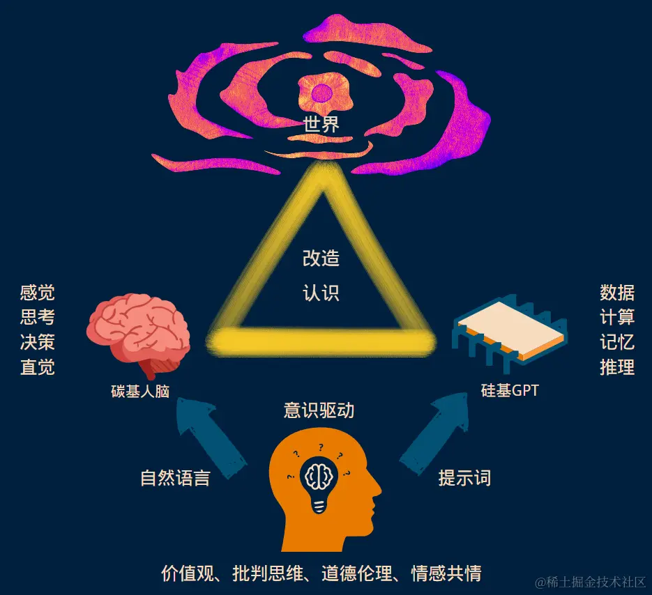 由于 GPT 跟人脑一样,能够跟意识之间用自然语言(提示词)沟通,这将大大降低人脑在两者沟通过程中的辅助载荷(例如:学习编程、写代码等),使得主观意识更有独立性,在认识世界和改造世界的过程中,实现给人脑和 GPT 分工,从而发挥它们各自的专长。