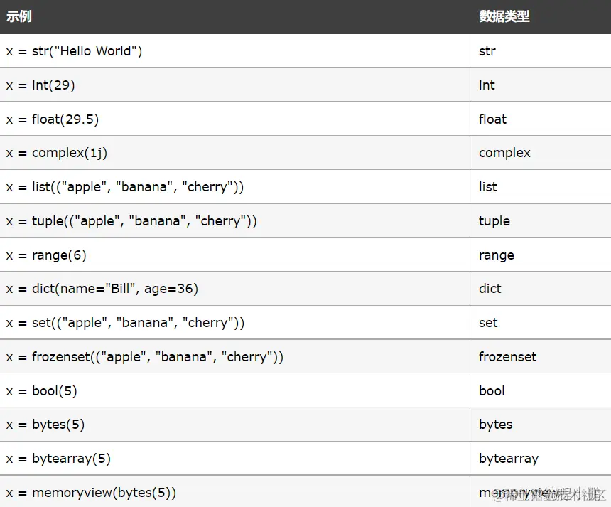 文本类型: str 数值类型: int, float, complex 序列类型: list, tuple, range 映射类型: dict 集合类型: set, frozenset 布尔类型: bool 二进制类型: bytes, bytearray, memoryview