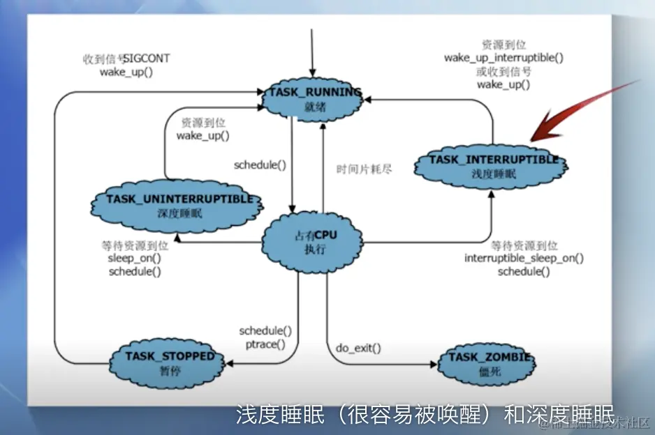 进程最基本的状态有三种: 就绪态,睡眠态和运行态,在具体的操作系统中,可能实例化出多个状态.