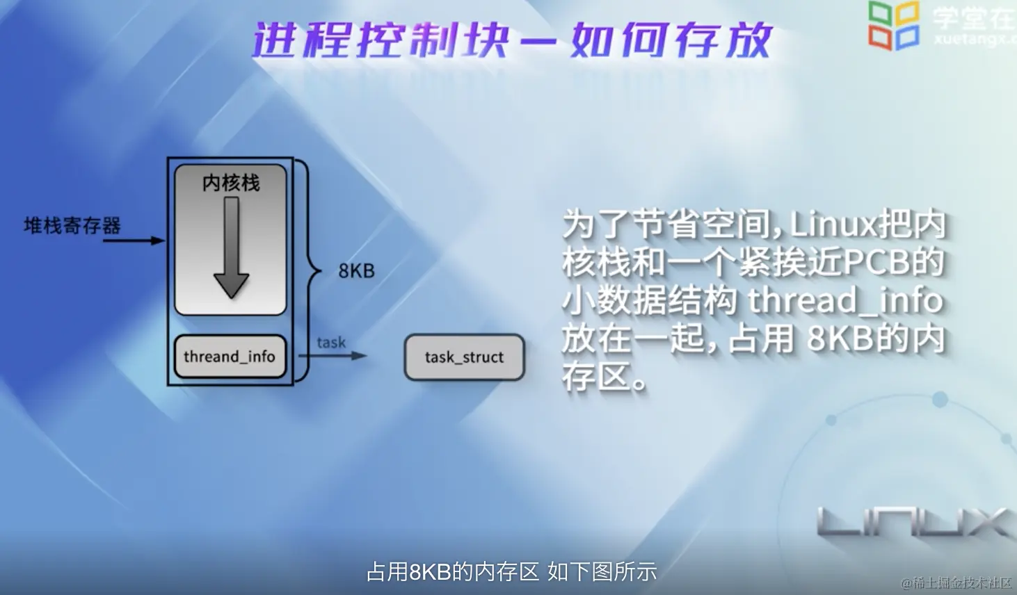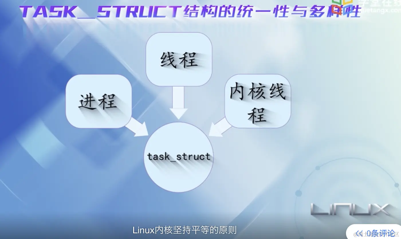 对于进程,线程,内核线程,内核使用唯一的数据结构task_struct来分别表示,也使用相同的调度算法对其进行调度.