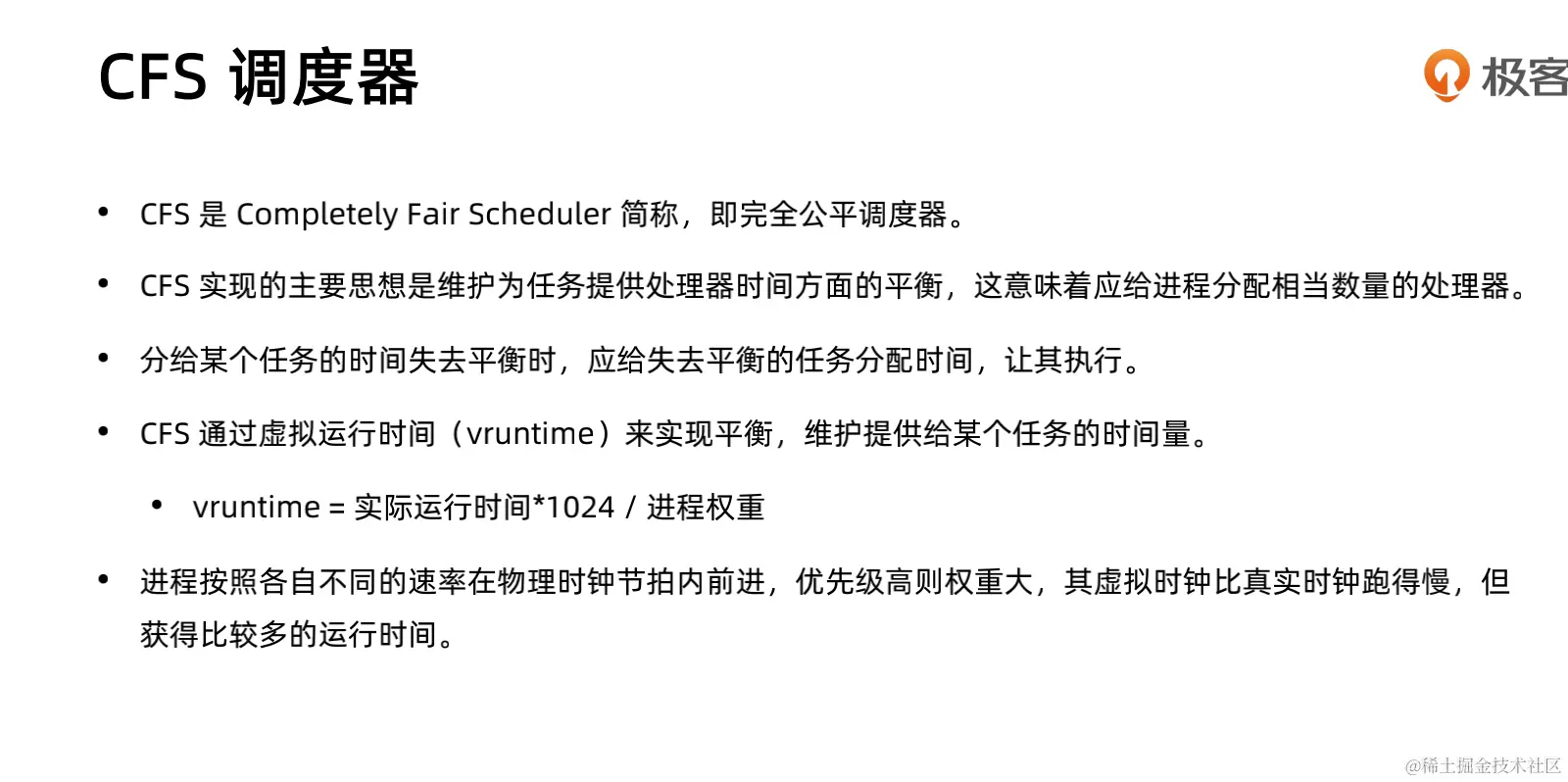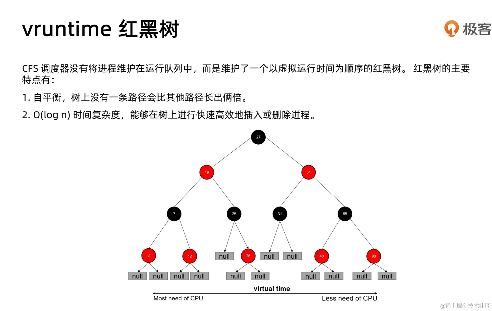 CFS中的就绪队列,就是一棵已虚拟时间为键值的红黑树, 虚拟时间越小的进程,越靠近红黑树的左端, 调度器每次选择位于红黑树左端的进程.