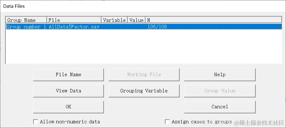 选中Group Name后,点击“File Name”,选中需要的“.sav”数据。在“N”中看到数据的样本个数正确,即说明数据导入成功。