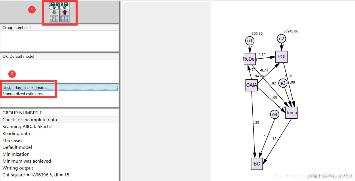 此外,在模型上方的视图调整按钮,我们可以选择在右图中显示输出非标准化结果或标准化结果图像。其中,若为非标准化结果,自变量、残差旁的数字代表其方差;而对于标准化结果,箭头旁的数字代表对应回归方程的R方。