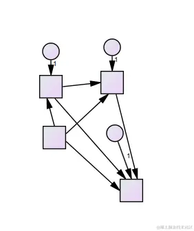 随后,依据上述关系在Amos中绘制路径图。其中,由于AMOS路径图表示的为线性回归模型,因此所有因变量(即有箭头指向的变量)都需加上一个残差项(就是下图中这个圆圆的东西)。