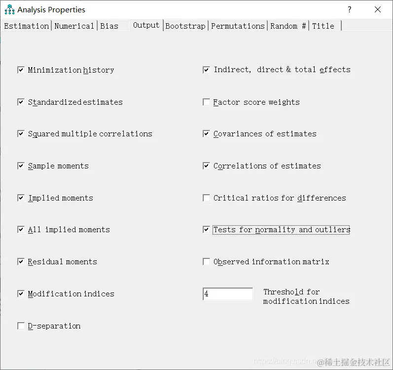 点击软件左侧“Analysis properties”,打开“Output”,即可对输出的结果加以选择。这里均位各种模型情况评估指标,例如模型整体拟合度评估指标、测量模型评估指标和结构模型评估指标等。一般的,我们按照如下的设置即可。