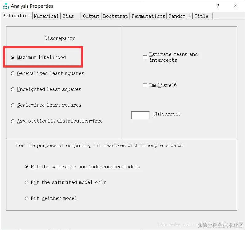 点击软件左侧“Analysis properties”,打开“Estimation”,即可对模型的相关方法加以选择。