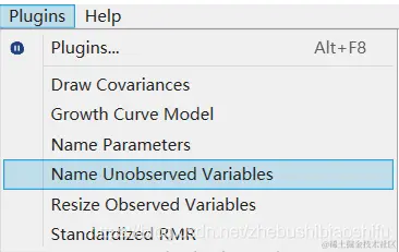 随后对残差项加以命名。点击软件上方的“Plugins”→“Name Unobserved Variables”,即可实现对图中的全部残差项加以命名。