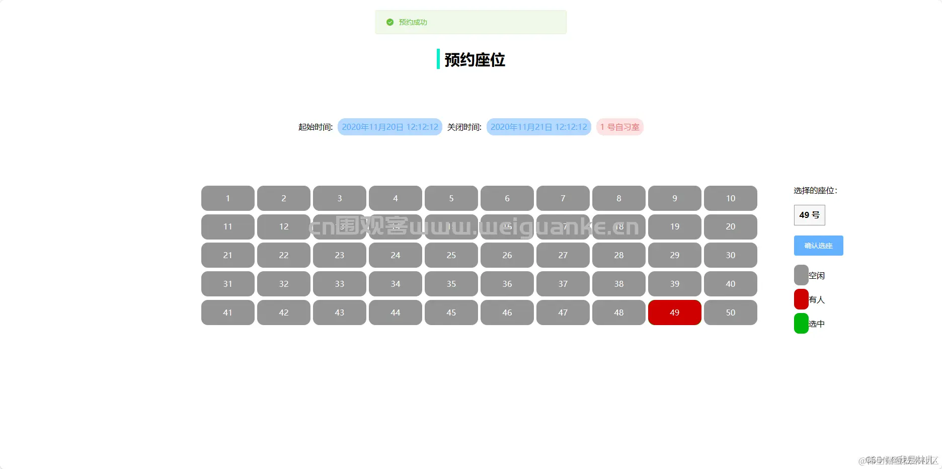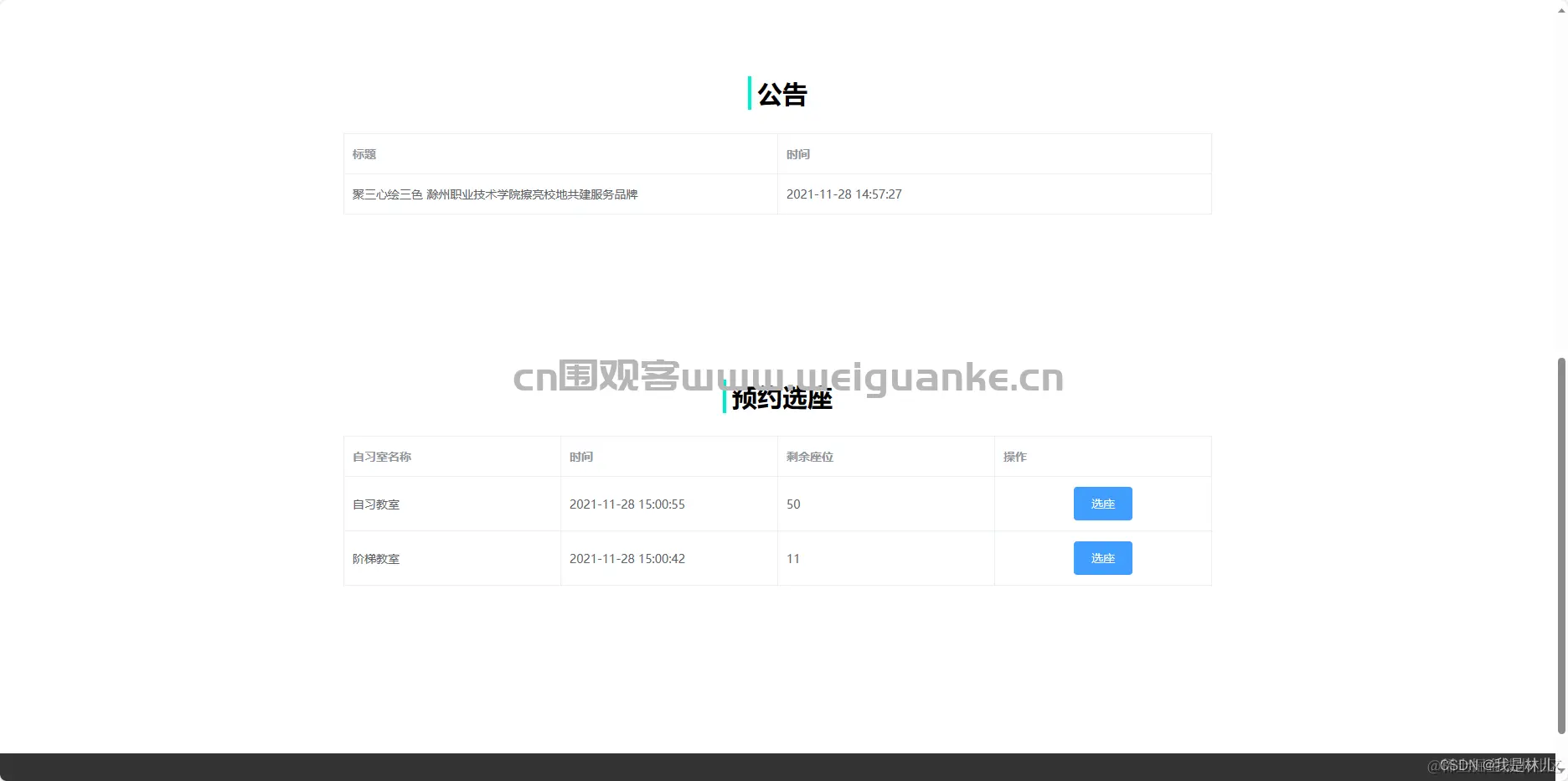 基于springboot+vue的自习室选座系统java教学jsp源代码mysql 木木学长 2023-09-10 157 阅读1分钟 本项目为前几天收费帮学妹做的一个项目,Java EE JSP项目,在工作环境中基本使用不到,但是很多学校把这个当作编程入门的项目来做,故分享出本项目供初学者参考。 一、项目介绍 基于springboot+vue的自习室选座系统 项目有1权限:用户管理员 二、主要功能 用户注册 用户登录 留言列表 公告 预约选座 预约座位 三、项目截图