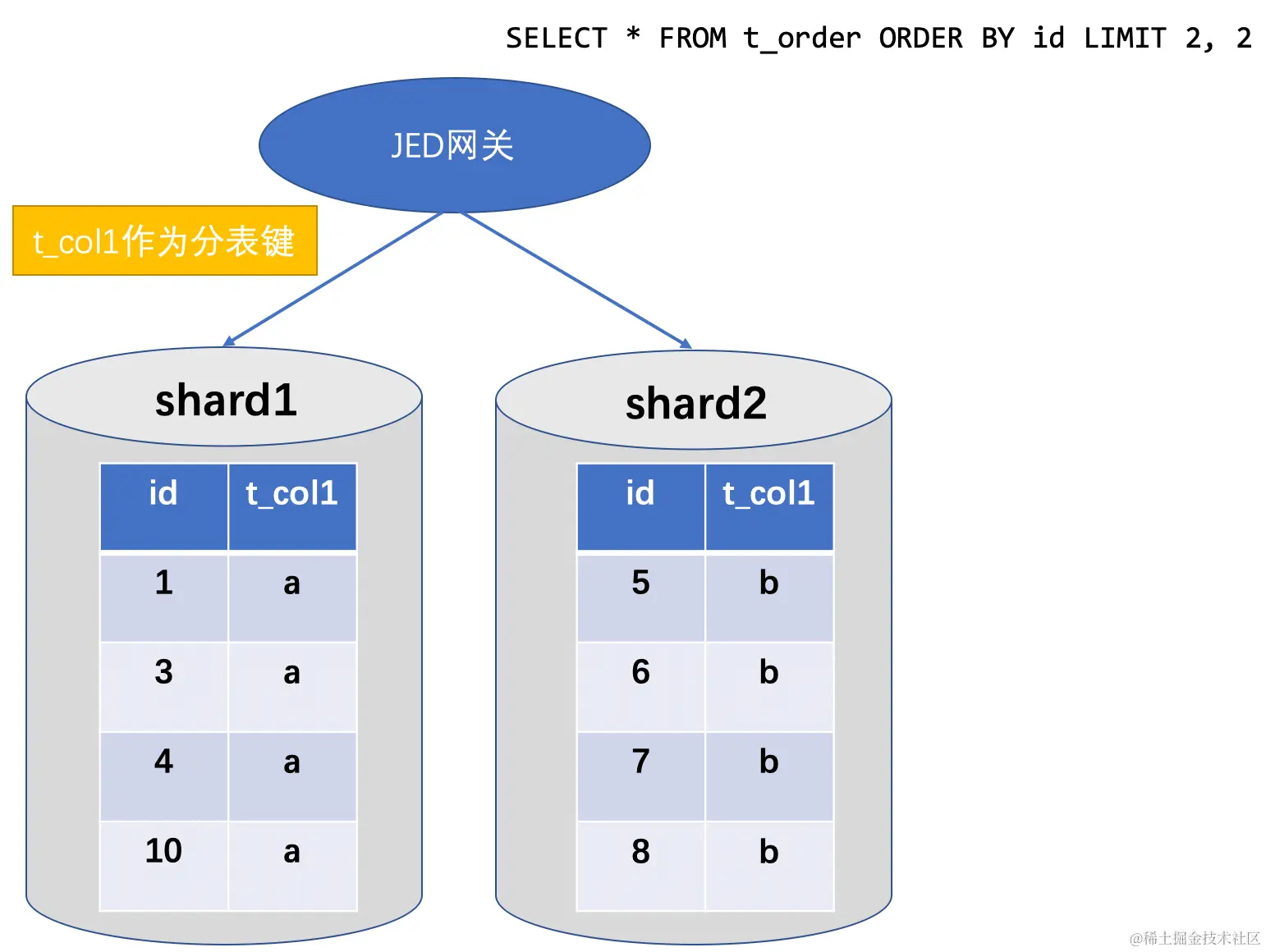 再将返回的结果集在内存排序后,取第2条之后的两条数据{(id : 4, t_col1 : "a"),(id : 5, t_col1 : "b")} 返回用户。