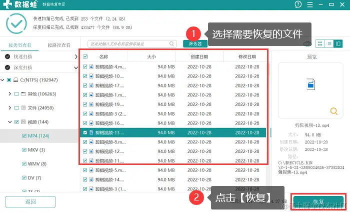 4.深度扫描的速度会以内存卡文件的大小、多少等决定,在扫描结束后,可以直接搜索文件的名称,也可以按不同的文件类型快速的定位到相关的文件,然后进行选择。