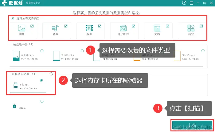 2.在注册界面,可以先点击 【免费试用】 ,然后选择您想要恢复的文件类型来进行扫描,并勾选上内存卡所在的2.驱动器,点击 【扫描】 ;