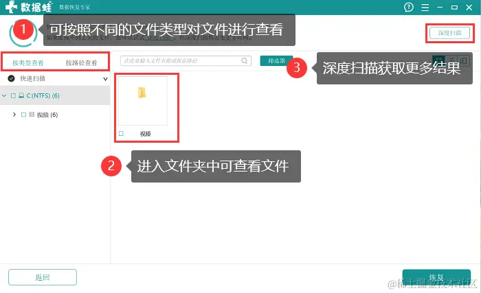 3.第一次扫描通常耗费时间较短,但扫描到的结果可能会较少,如果没有看到需要恢复的文件被扫描到,建议点击 【深度扫描】;