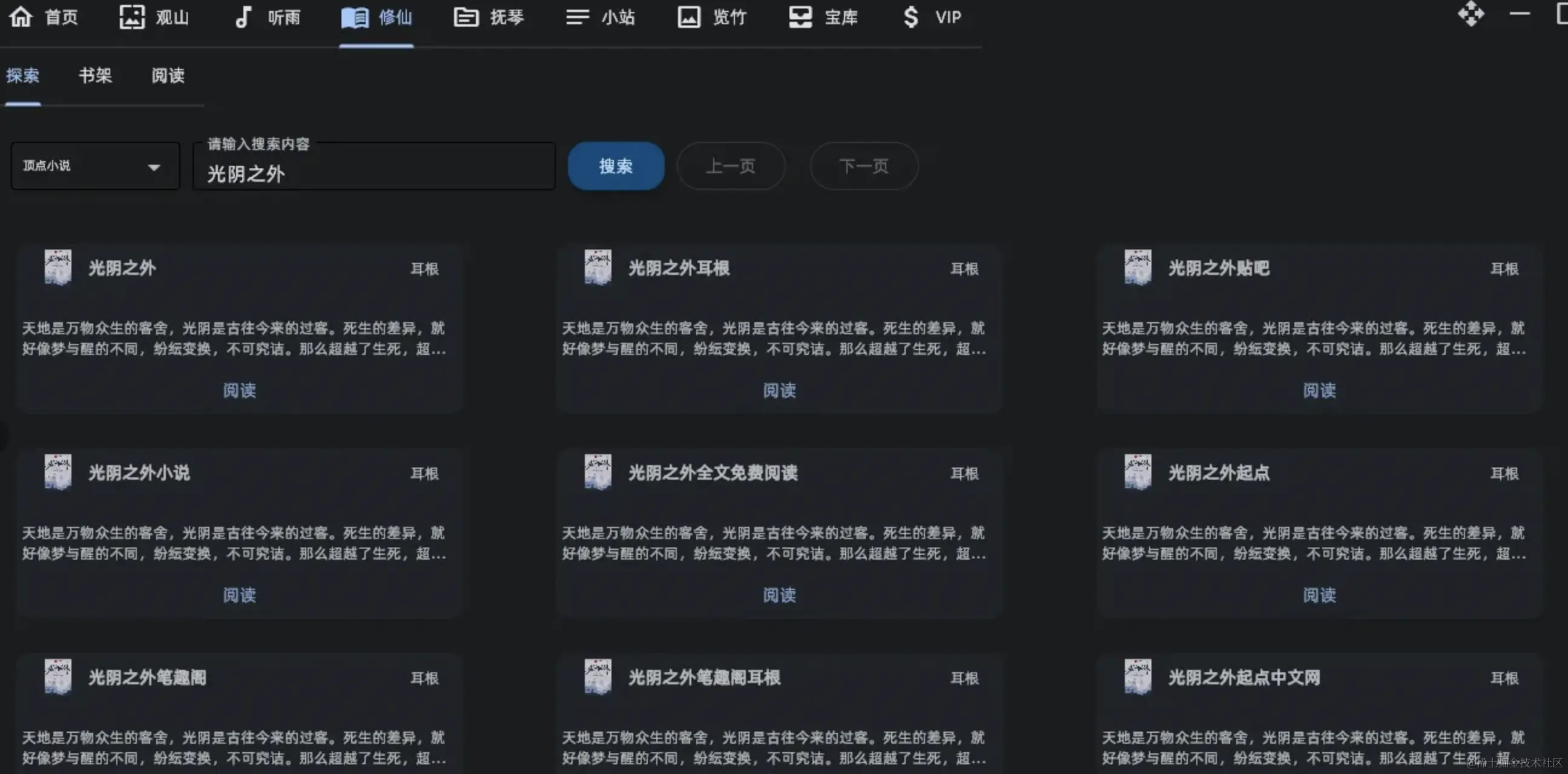 修仙提供了小说阅读功能,左上角可以切换小说源,可以搜索观看网络小说,可以搜索观看近现代小说,甚至古代小说,并且网络小说的更新还比较及时。