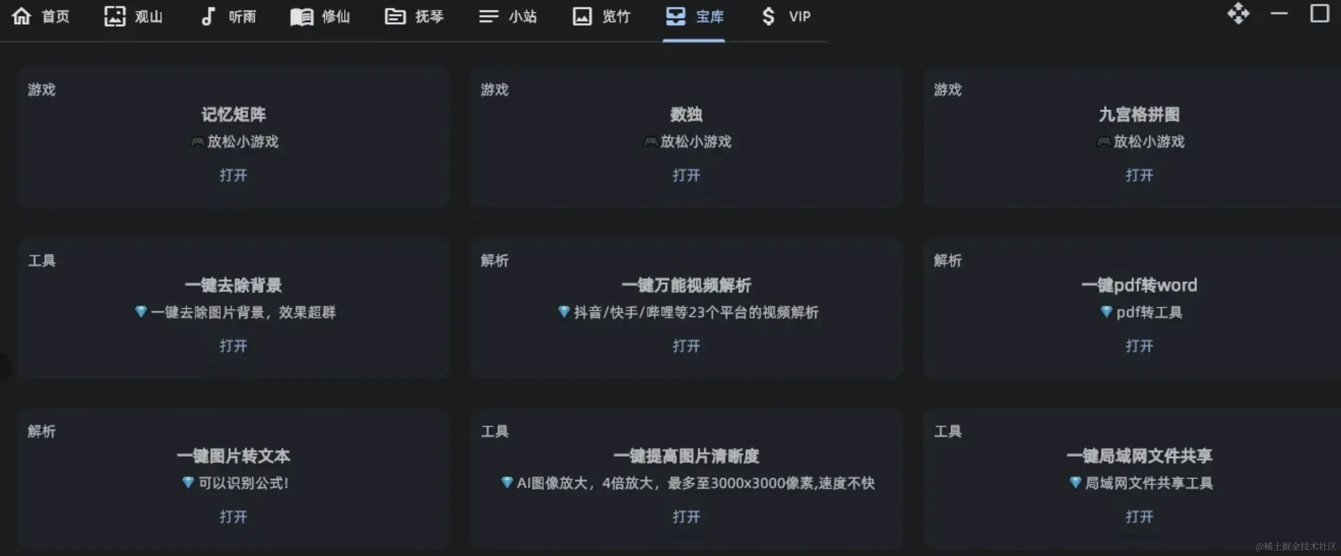 宝库包含了各种工具和小游戏,例如记忆力游戏、九宫格、数独游戏;又例如视频地址解析、pdf转word、局域网文件共享;又例如ai律师、ai求佛等。不过部分功能只支持VIP用户。