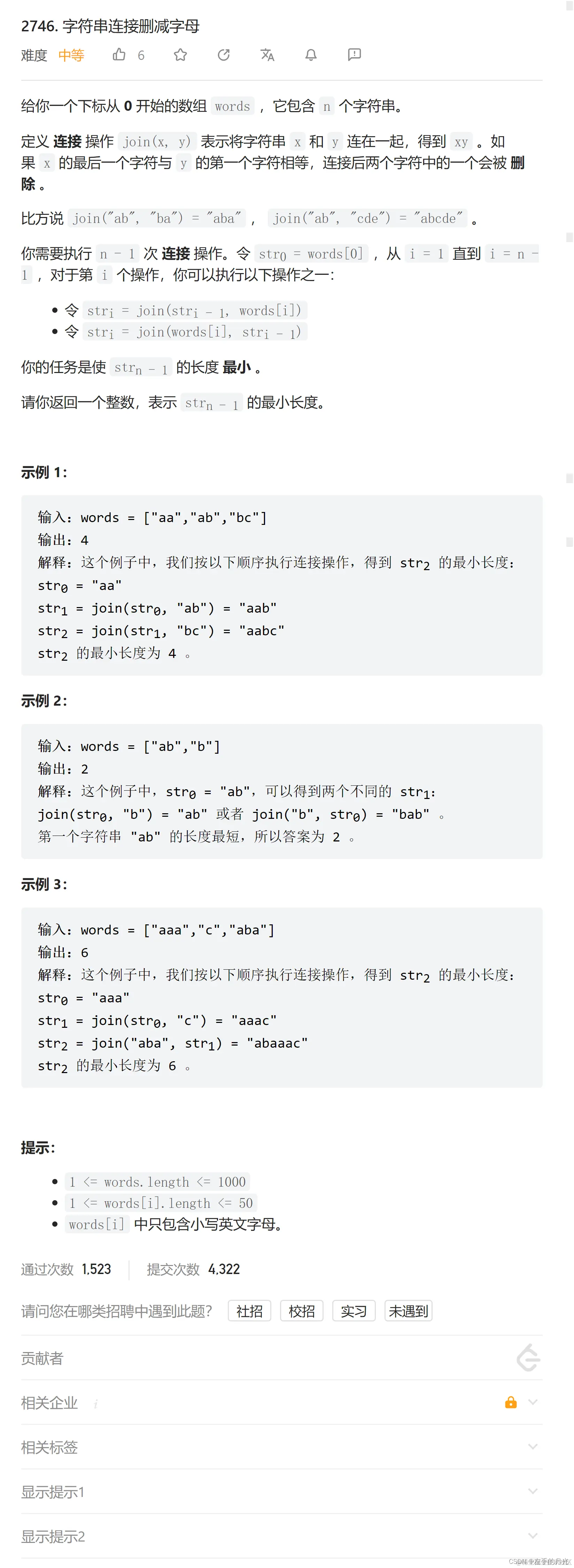 具体地,添加完第 i−1 个字符串 x…y,接下来将添加第 i 个字符串 时,令 f[j] 表示使用前 i−1 个字符串得到的字符串开头为 j,结尾为 y(即以第 i−1 个字符串结尾)时能重叠的最多字符数。类似地,令 [j] 表示使用前 i−1 个字符串得到的字符串结尾为 j,开头为 x(即以第 i−1 个字符串开头)时能重叠的最多字符数。