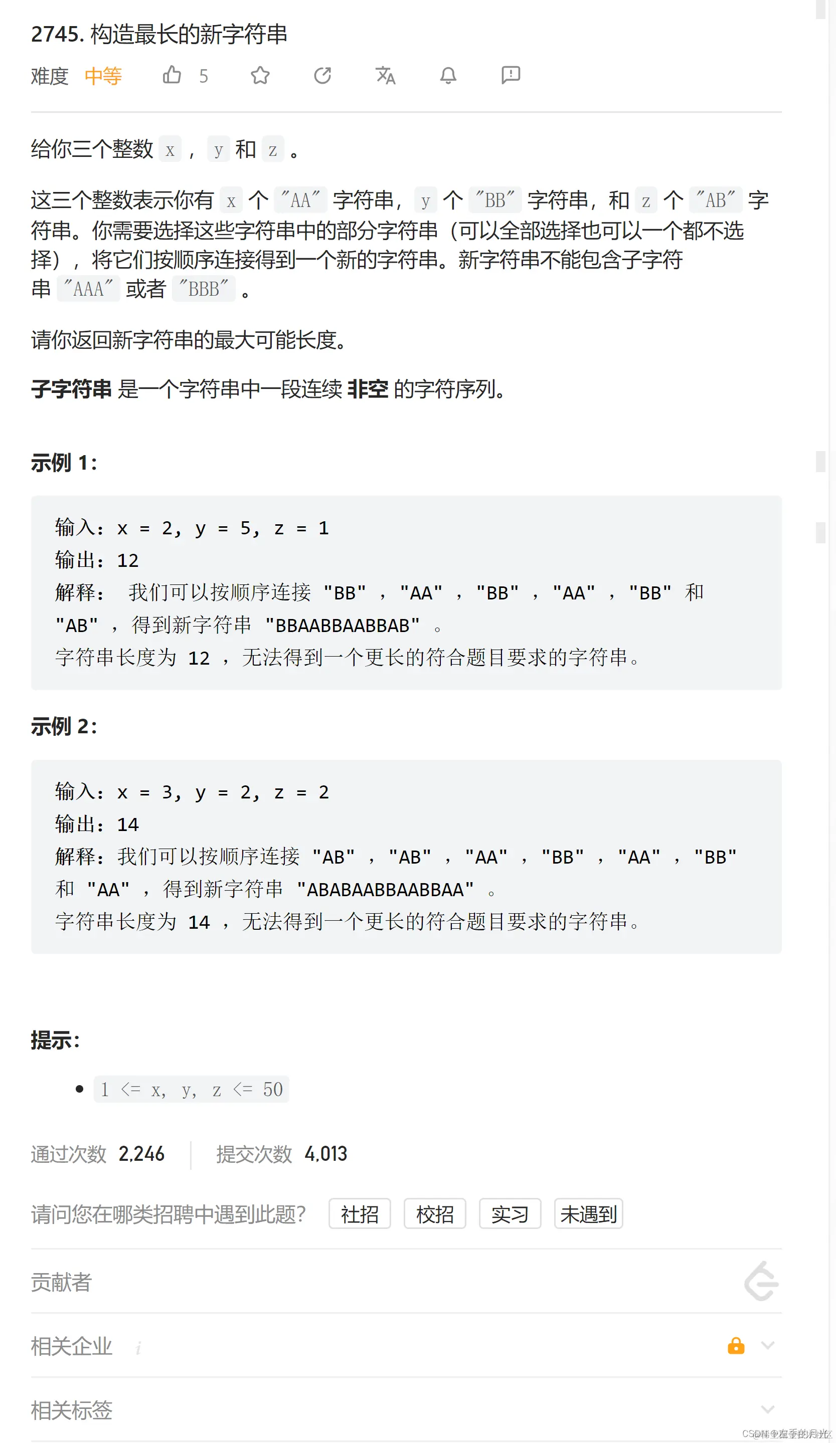 (1)如果x>y,显然 AA 最多只能放进来 (y+1) 个,因为剩下的 AA 后面就没东西可以接了。而 AB 可以放在最开头,形成 ABAB...ABAABBAABB...AA 这样的字符串。因此这种情况的答案是 (2y+1+z)×2。