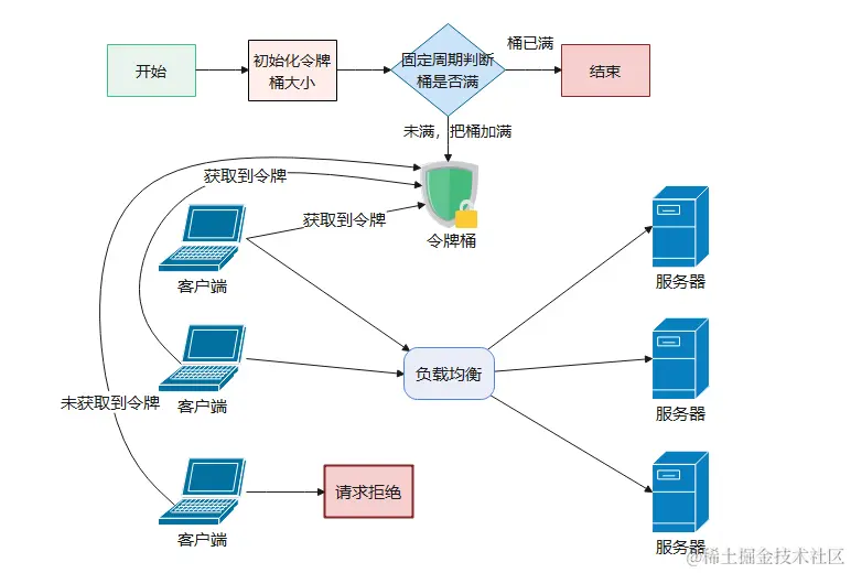 令牌桶算法中的令牌也是一样,客户端在发送请求之前,都需要先从令牌桶中获取令牌。如果取到了,就发送请求;如果取不到令牌,就只能被拒绝需要等待。