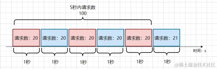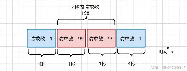 前 4 秒只有一个访问量,第 5 秒有 99 个访问量;第 6 秒有 99 个访问量,接下来的 4 秒又只有 1 个访问量。从全局看,10 秒内 200 个请求流量没有超出,但从图中来看,这种流量情况肯定是异常的。
