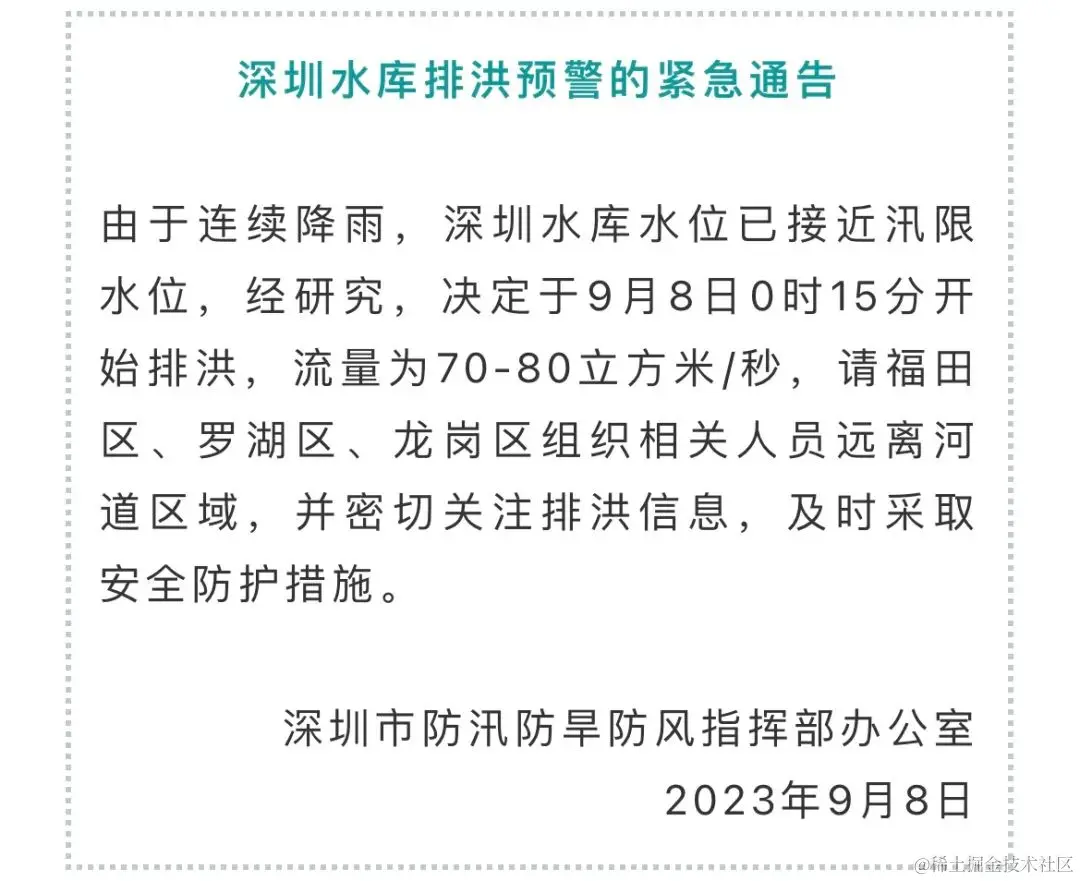 9 月 8 日,距离上一次台风过去还不到一周的时间,深圳又发布了泄洪预警信号: