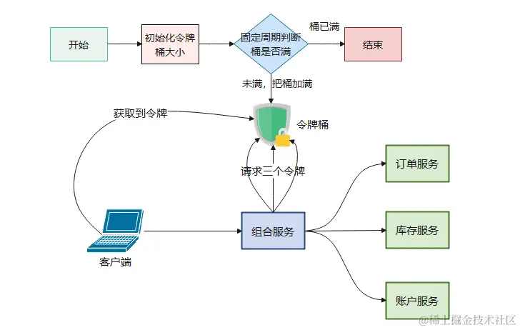 有一种改进是,客户端在调用服务之前首先获取 4 个令牌,调用组合服务时减去一个令牌并传递给组合服务三个令牌,调用子服务时分别消耗一个令牌。