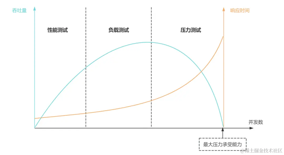 超过安全负载的情况下,增加并发请求数,对系统继续施加压力,直到系统崩溃或不再处理任何请求,此时的并发数就是系统的最大压力承受能力。