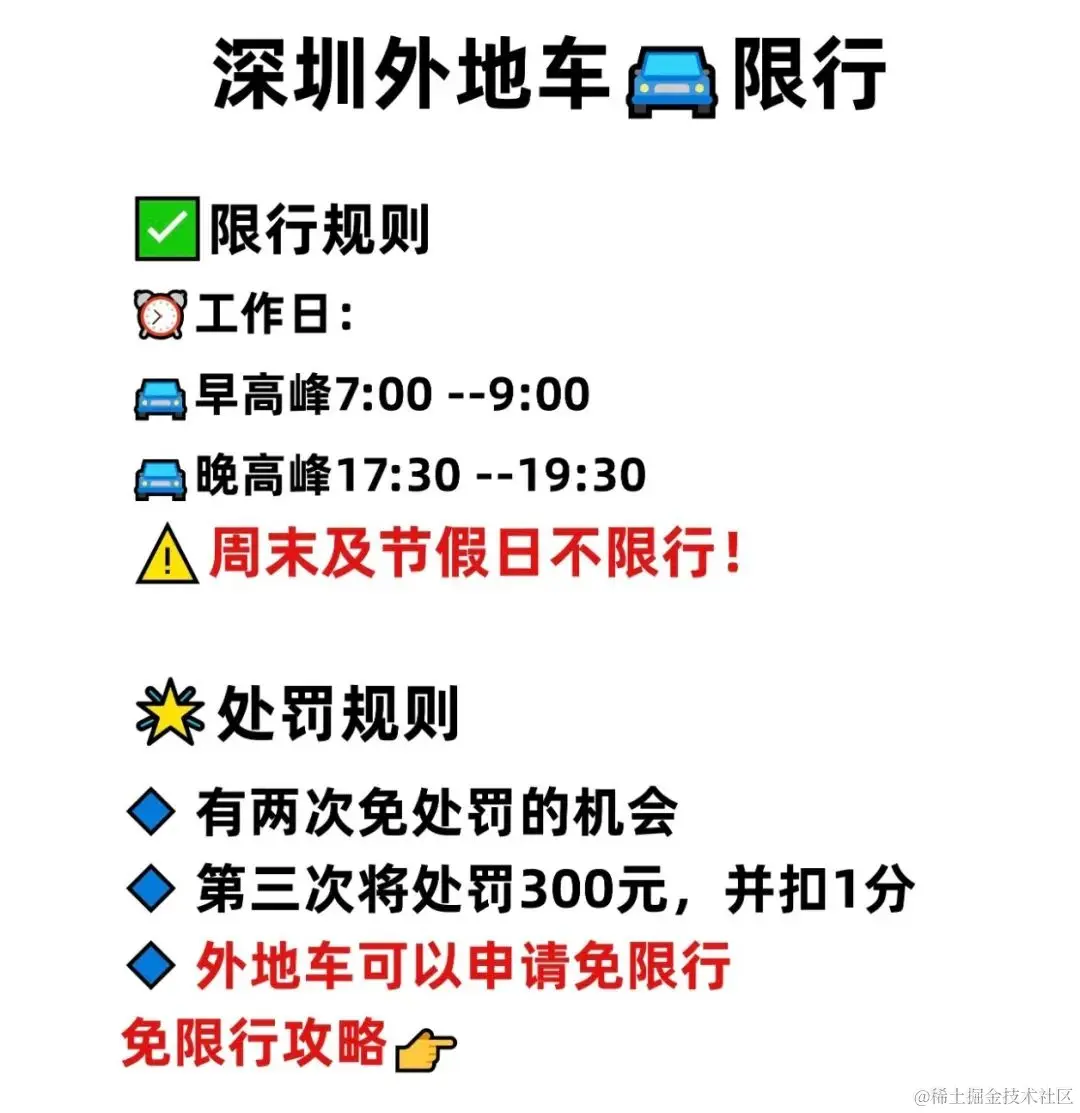 比如在深圳,外地车只能在规定日期(周末或者节假日)出行,或者在规定的的高峰时间段(工作日上午 7 点至 9 点,下午 5 点半至 7 点半)不允许出行,都属于维持交通系统正常运转的限流方式。