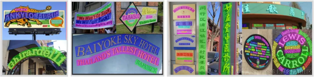 图6 Total-Text(左)、CTW1500(中)与ArT(右)检测结果可视化