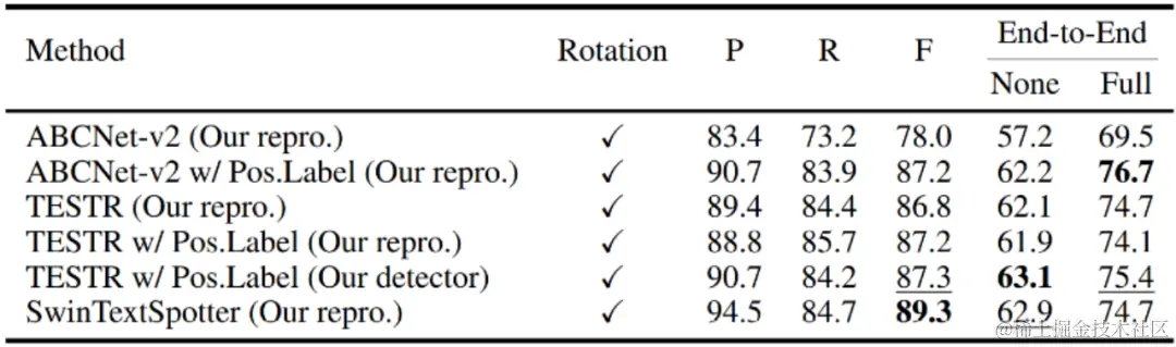 最后,我们也选择了一些端到端识别模型在Inverse-Text上进行测试。在预测控制点类型的模型上测试位置性标签后,检测F值仍有明显的提升。另外,相比于这些模型在Total-Text上的性能表现,这些模型在Inverse-Text上直接测试能达到相似的检测精度,但是端到端识别精度显著更低,这也说明端到端识别模型对于高度旋转以及反向文本的识别鲁棒性仍有较大的提升空间,Inverse-Text可以作为测试集,便于后续有关工作评估真实场景中模型对旋转文本的识别鲁棒性。