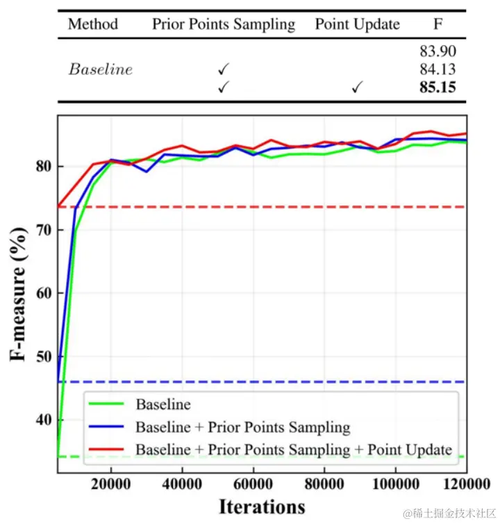 为了进一步揭示EPQM中让训练收敛更快的因素,我们进行了进一步的消融,结果如图10所示。可以发现当进行点的更新时,模型的精度与收敛速度得到了更多的提升,而显式的点采样是进行点位置更新的先决条件。这表明在针对控制点query的构建过程中,对稀疏点的显式建模是提升训练效率的关键所在。之前的有关工作[2][6]表明,来自显式框的query或者进行RoIAlign的稀疏特征采样有助于提升DETR类模型的训练效率,在我们对场景文本检测设计的模型中,进一步证明由于任务与需求的差别,相比于框的信息,稀疏的显式点更能加速收敛与提升精度。