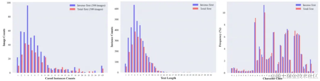 图8 Inverse-Text与Total-Text测试集在每张图片包含的文本数量、文本长度、字符类别频率等统计指标上的对比