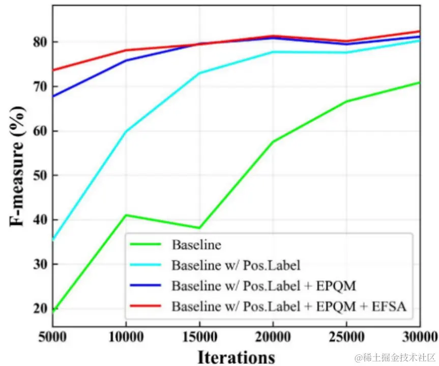 关于EPQM与EFSA: 根据表2结果与图9收敛曲线,两个模块均对模型性能与收敛速度有明显贡献,并且推理速度的损失较为可观。其中EPQM大大加速了模型训练的收敛,可以减少所需的训练成本。除此以外,相比于原始标签形式,位置性标签为这两个模块提供了更合适的监督信号,模型因此精度更佳,模型结构方面的优化与监督信号方面的改进是展现了适宜的互补关系。
