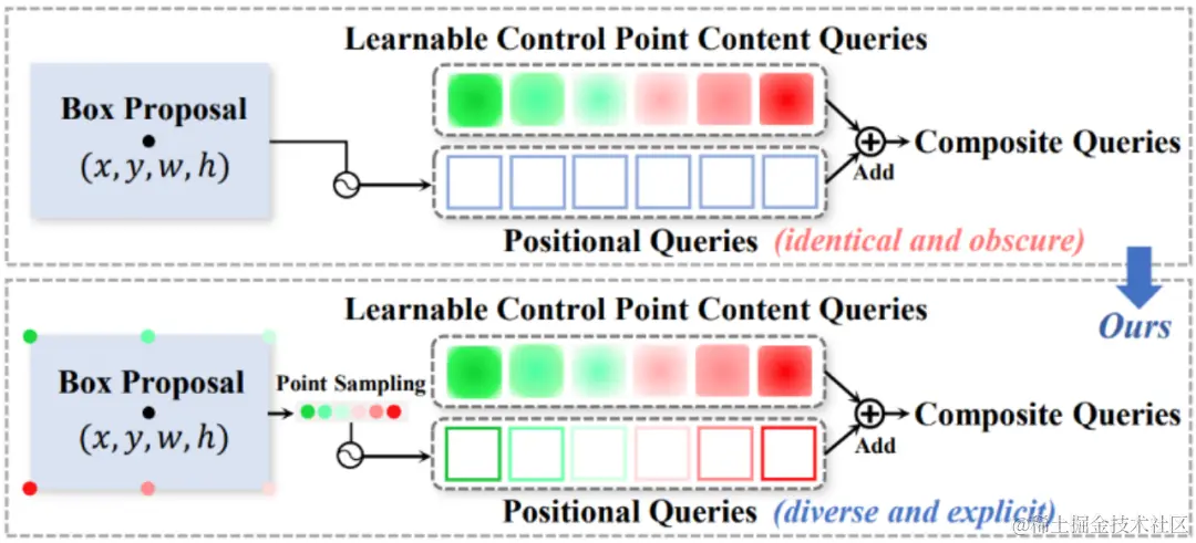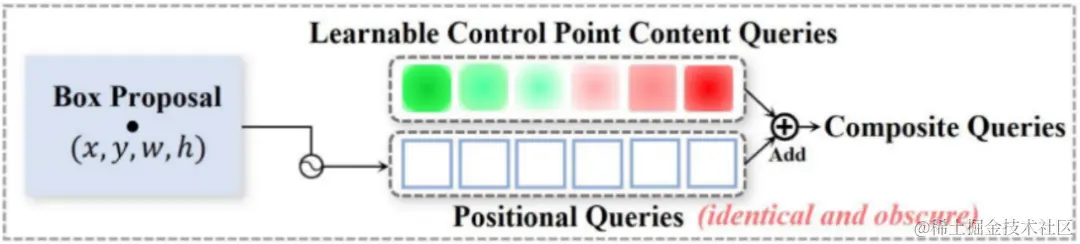 对此,近期的工作[3]进一步利用固定数量的控制点query表示每一文本实例,同一文本中不同控制点的positional query共享着编码器后提供的检测框位置信息,如图1所示。我们发现这种建模方式虽然提供了位置先验,但是对于预测控制点的目标来说,这种先验还不够精确,各控制点query缺少了各自独特的、显式的位置信息,并且在解码器中位置信息也难以被逐层更新,这些问题导致了模型训练收敛相对较慢。 因此,本文对如何构建更高效的query展开了进一步的探索。
