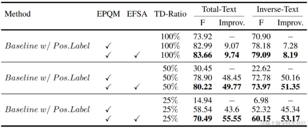 在DETR的检测框架中,本文主要从如何更好地构建query与如何更有效地监督模型这两个互补的角度,回答了怎样迈向更好的场景文本检测这一问题。最终的模型取得了训练收敛速度、数据效率、检测鲁棒性等方面明显的提升,在仅以1 FPS的推理速度损失为代价的情况下,在三个数据集上取得了当前最佳性能。