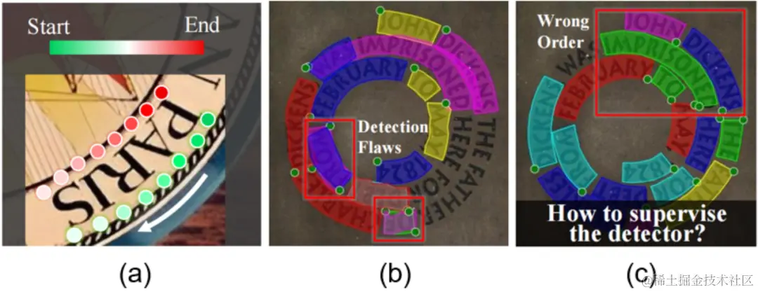 图2 (a)控制点标签顺序反映了阅读顺序。(b)检测器受到标签影响,隐式地学习阅读顺序而对同一文本产生不同起始点的预测,造成假正例等错误。绿色点为预测的起始点。(c)即使采用充分的旋转数据增强,检测模型也不能很好地学习到正确的阅读顺序。