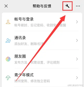 步骤2:在【帮助与反馈】页面点击右上角的【扳手】图标进入到【微信修复工具】页面。